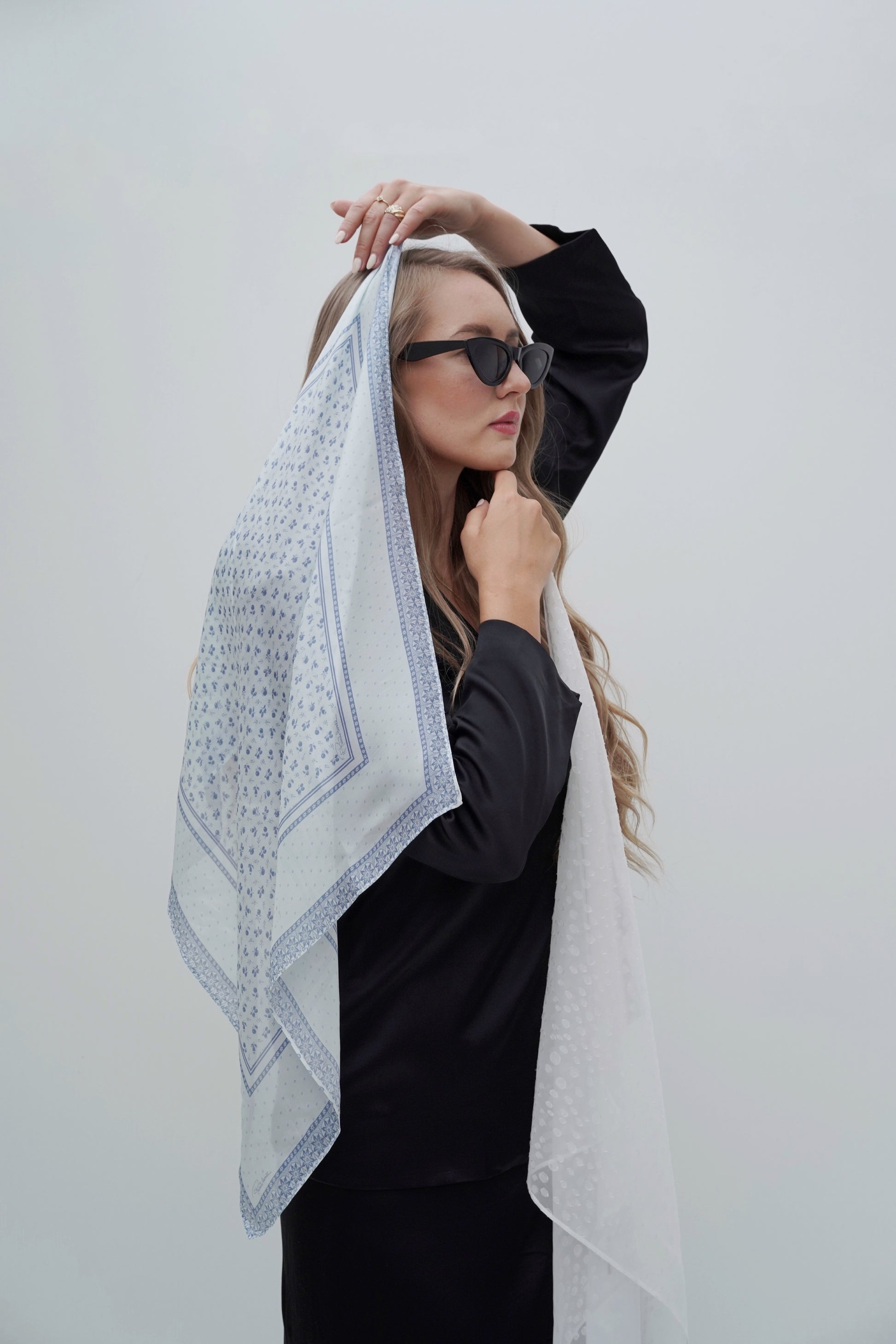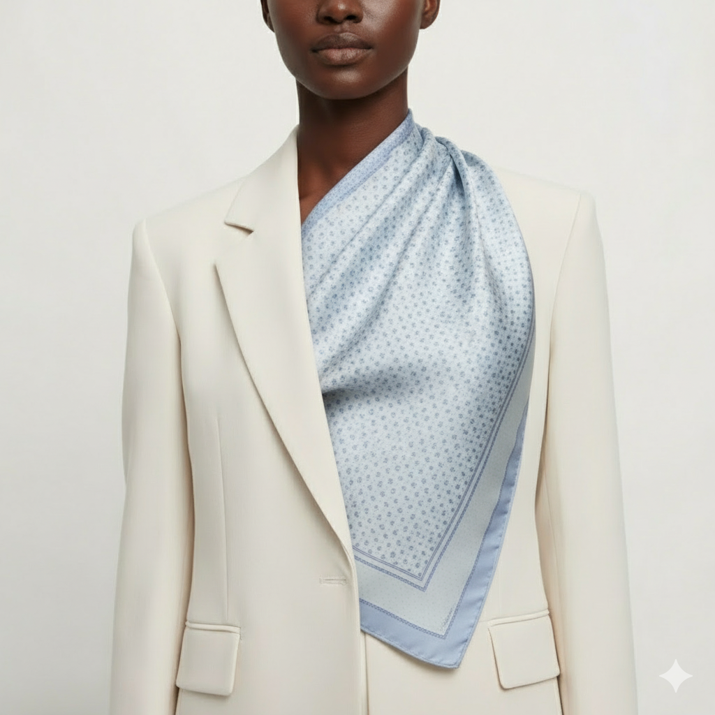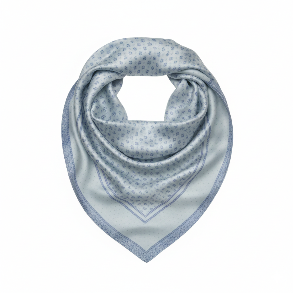 Ein hellblau gemustertes Seidentuch – modern, fein und elegant verspielt.