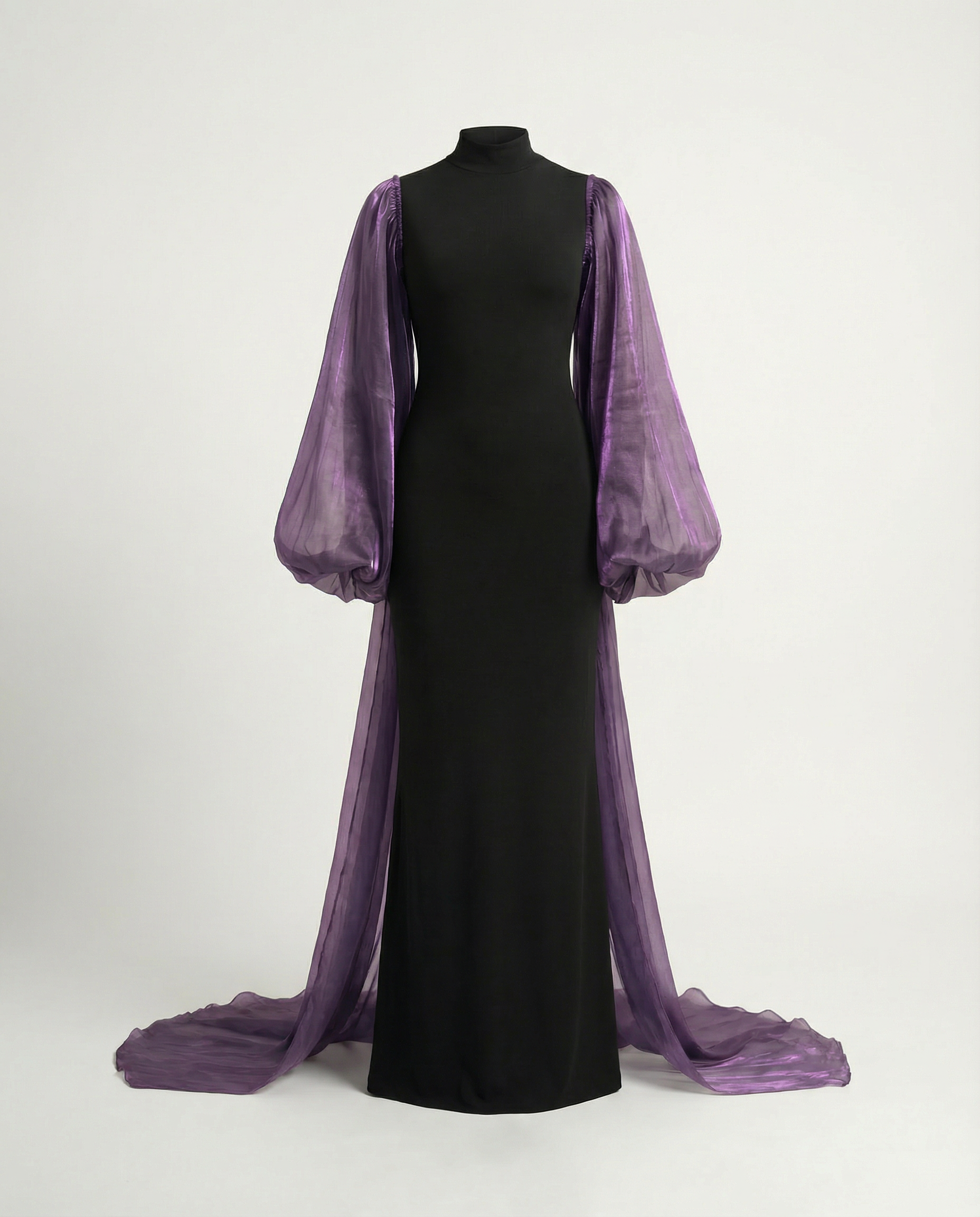Transparente Organza-Ärmel und die lange Schleppe in Amethyst verleihen dem reduzierten Design eine subtile, elegante Bewegung.