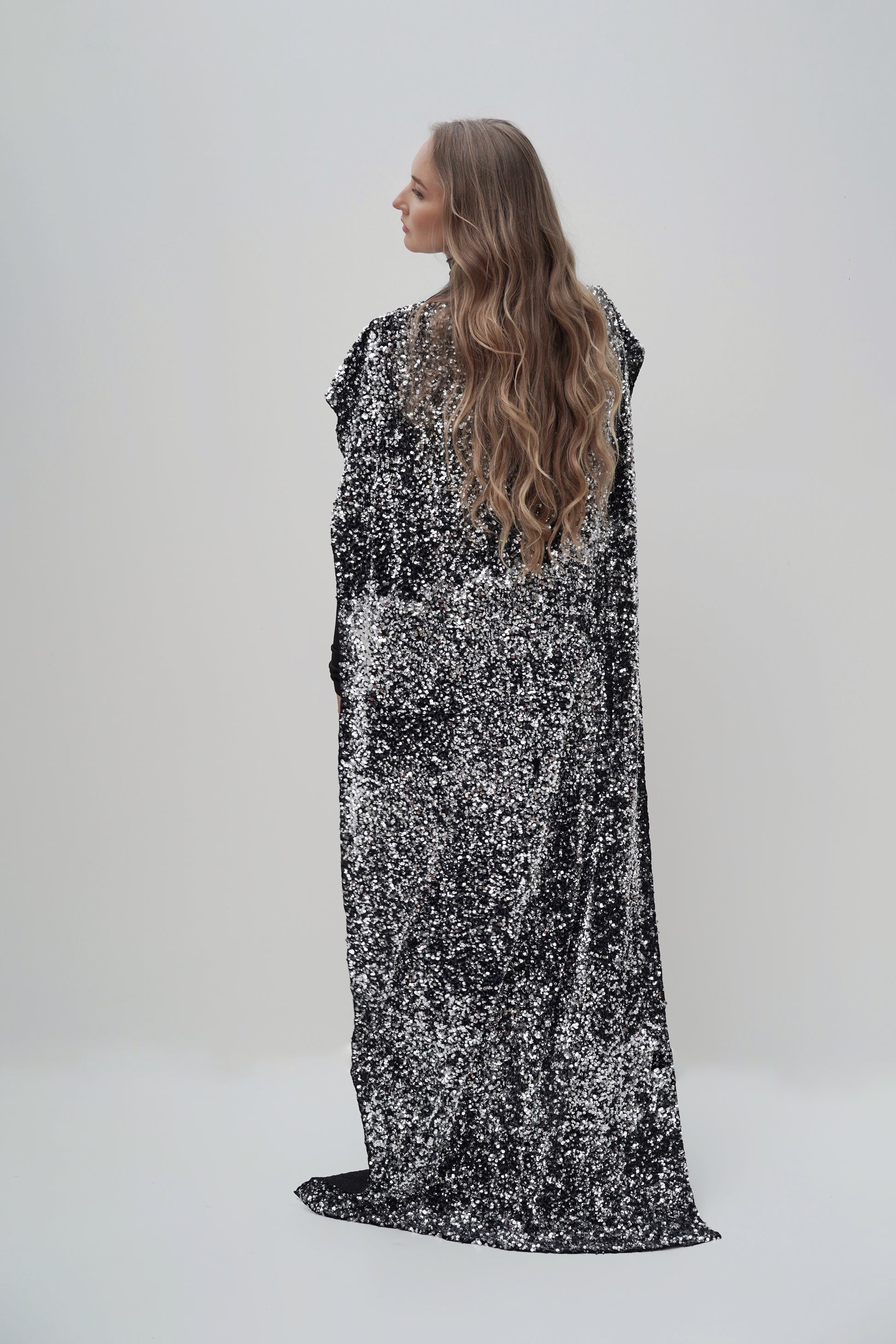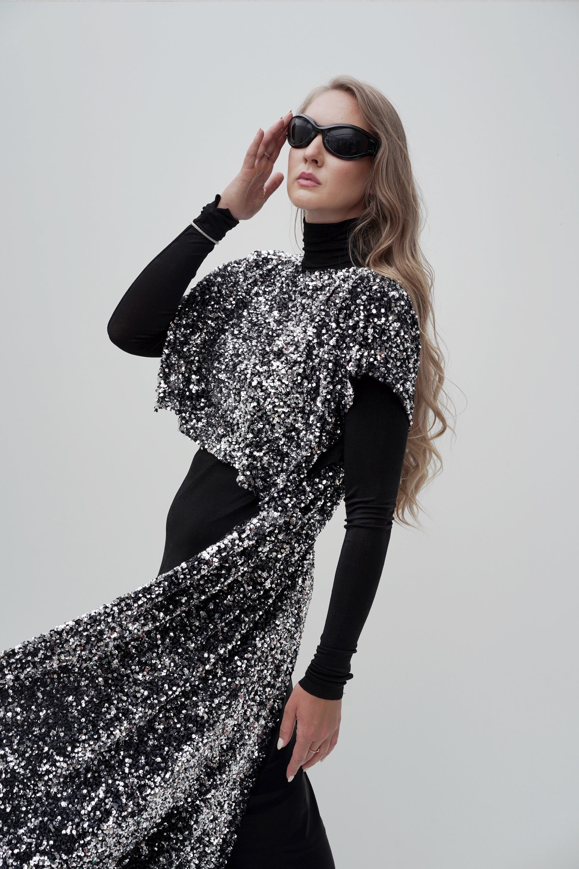 Ein elegantes Pailletten-Kleid mit bodenlangem Fall und schwarzem Unterkleid – modern, glamourös und perfekt für besondere Anlässe.