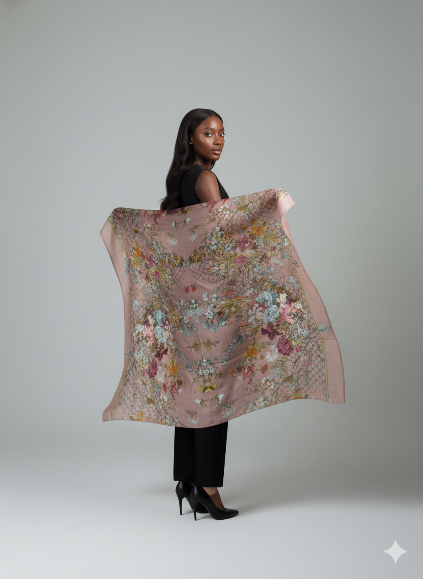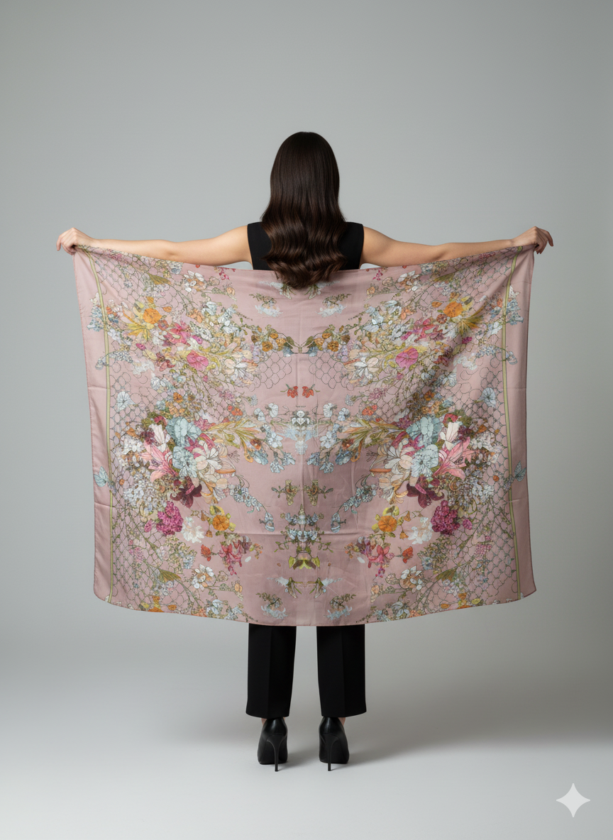 Ein zartes Tuch in Rosé mit floralen Details und feinen Schmetterlingsakzenten – feminin, edel und zeitlos schön.