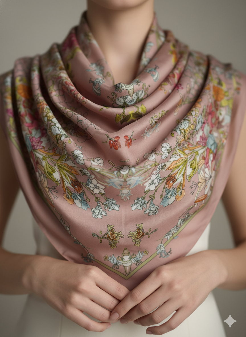 Ein Seidentuch als Halsschmuck, Haarband oder am Taschengriff gebunden – ein zeitloses Detail, das jeden Look veredelt.