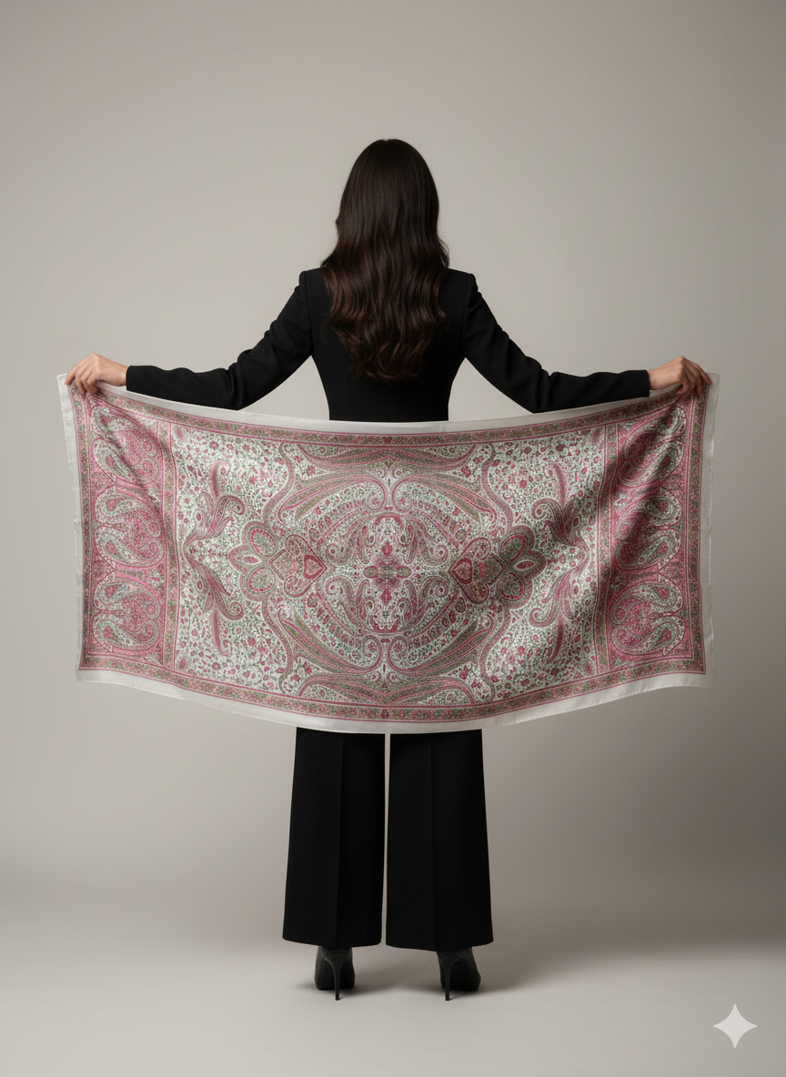 Ein edles Seidentuch mit feinem Paisley-Muster in Rosé- und Grüntönen – elegant, harmonisch und von zeitloser Schönheit.