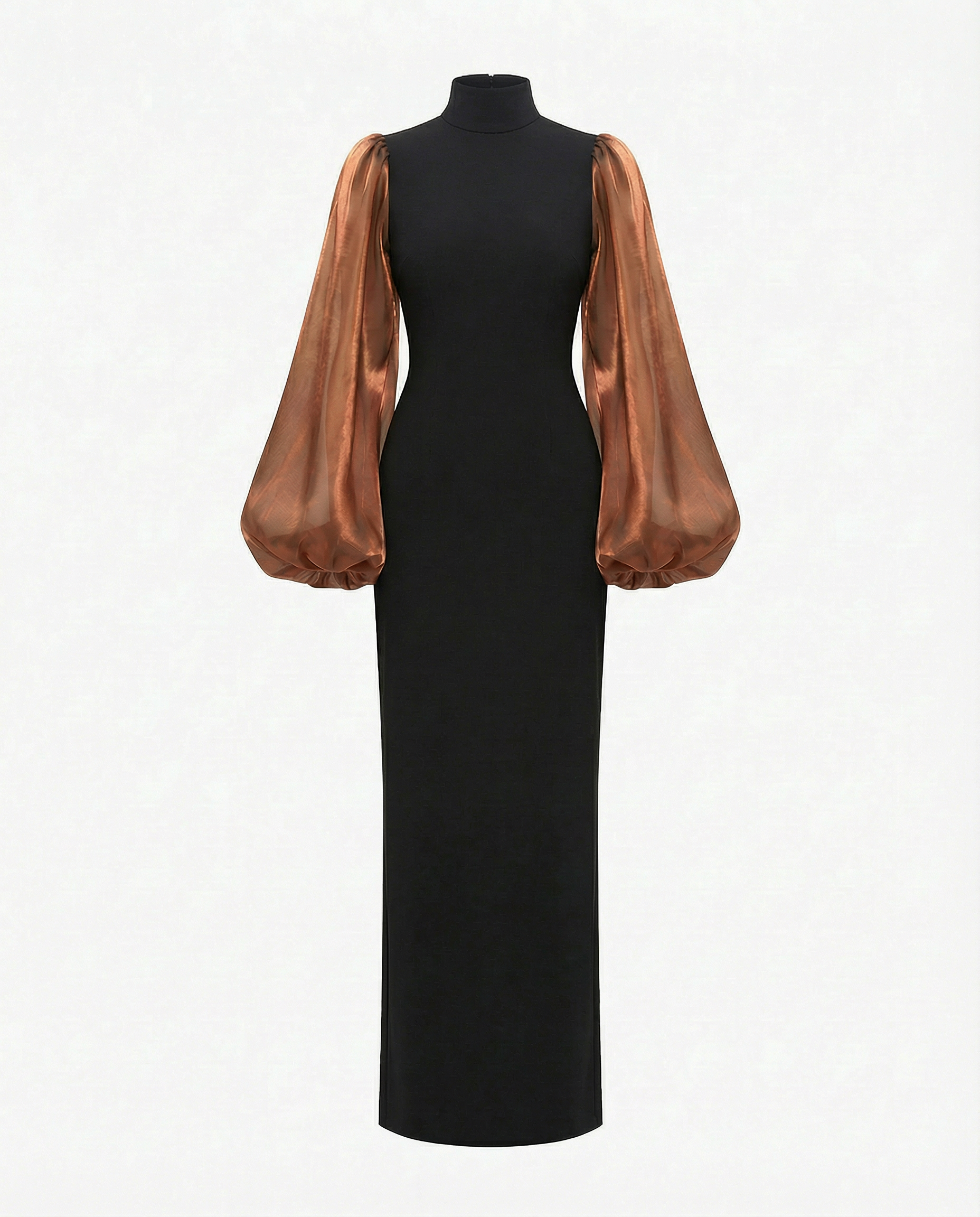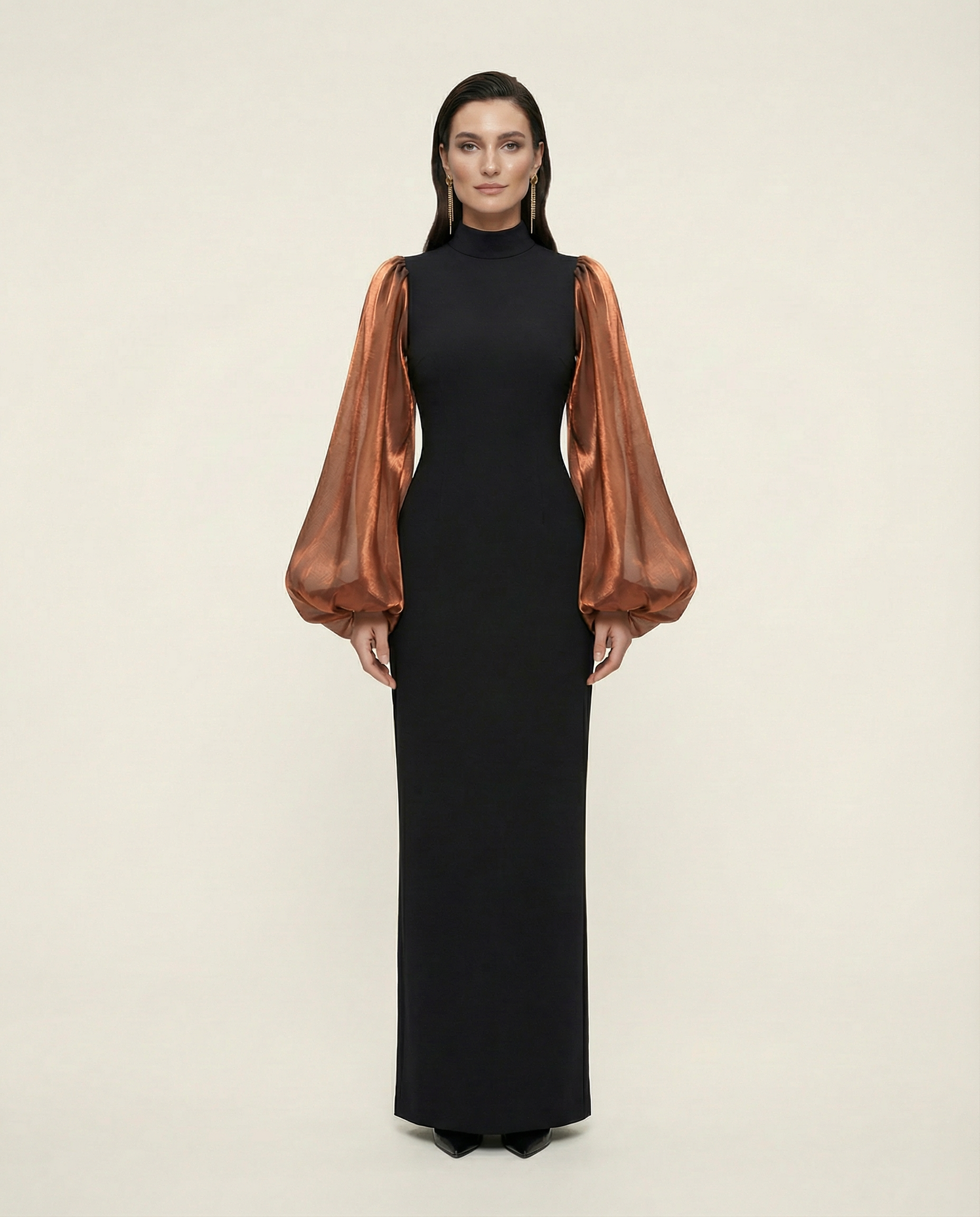 Die großzügig geschnittenen Ärmel aus Organza setzen ein bewusstes Statement und kontrastieren die klare, figurbetonte Basis. Bewegung, Leichtigkeit und Struktur verschmelzen zu einem ausdrucksstarken Gesamtbild.